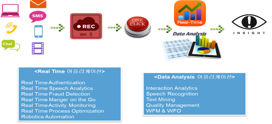 NICE Engage 플랫폼은 기존의 단순한 녹취 및 재생의 개념이 아니라, 옴니 채널 레코딩을 기반으로 다양한 비즈니스 어플리케이션과 연동하여 실질적인 비즈니스 인사이트를 도출해 낼 수 있는 진화된 플랫폼입니다.
